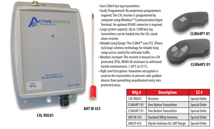 Designed as a receiver for the CLiK64 key-fob and ideal for any application where long range access is required, such as vehicles. Complete stand-alone autonomous use, allows simple programming of up to 1,000 key-fobs with entry granted on approved key-fob activation.